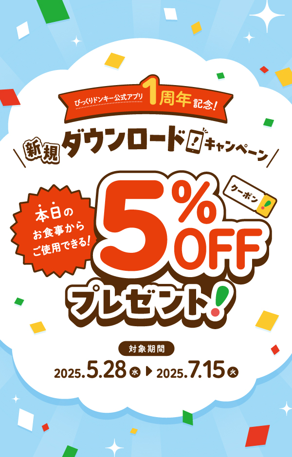 ※期間中びっくりドンキー公式モバイルアプリを新規ダウンロード・インストールした方に5%OFFクーポンを配信いたします。