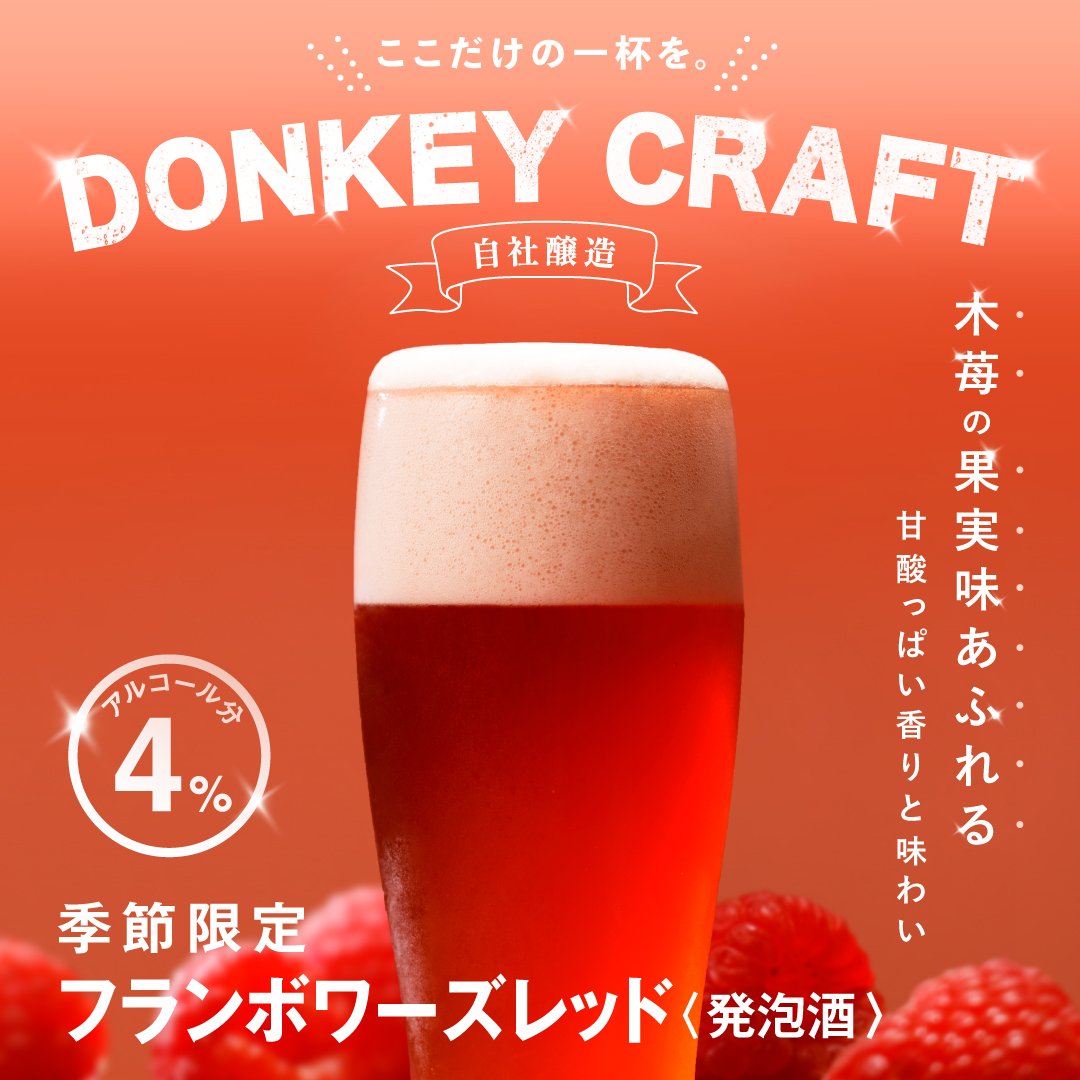 自社醸造の DONKEY CRAFT でここだけの一杯を。 季節限定の「フランボワーズレッド」を 10 月 8 日(水)より販売