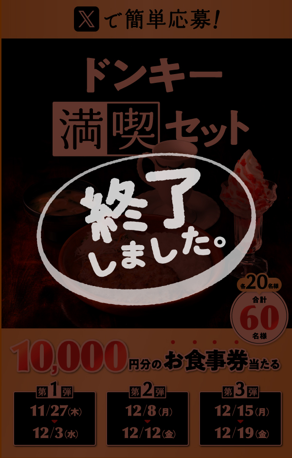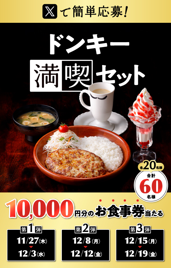 『ドンキー満喫セット』フェア開催にあわせて、公式Xでお食事券が当たる期間限定キャンペーンを開催します。