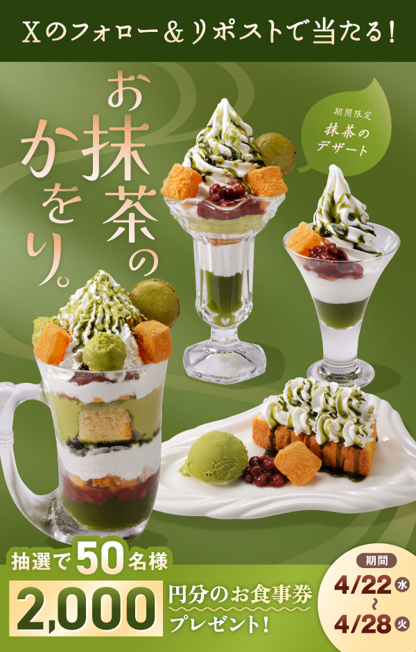 『抹茶デザート』フェア開催にあわせて、公式Xでお食事券が当たる期間限定キャンペーンを開催します。