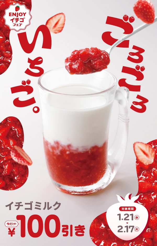 人気メニューの「イチゴミルク」を、期間限定で100円引きで販売するキャンペーンを開催します。