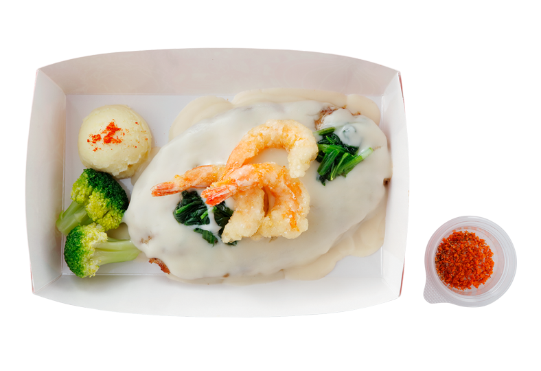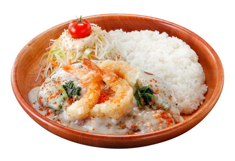 どこかホッとする、やさしい味わいのホワイトクリームで仕上げたハンバーグディッシュです。サクサク食感のフライドシュリンプがアクセント。