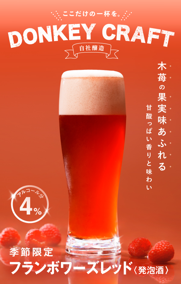 10月8日(水)から期間限定※で、木苺のフルーティーな甘みと華やぐ香りを愉しめる「フランボワーズレッド」が季節限定で登場します。また、ノンアルコールの「ドンキーフリー(フランボワーズ)」もあわせてご用意いたします。